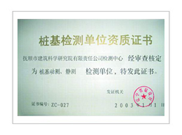 撫順市建筑科學研究院有限公司檢測中心成立于1989年,是經遼寧省質量技術監督局計量認證并經遼寧省建設廳批準確定的檢測機構.主要檢測業務范圍有單樁豎向抗壓靜載試驗、單樁豎向抗撥靜載試驗、單樁水平靜載試驗、天然地基承載力靜載檢測、復合地基承載力靜載檢測、低應變及高應變動力檢測、建筑工程與家裝污染檢測與治理,其計量證書編號為:(2003)量認(遼)字(U0037)號,資質證書編號為:遼建設廳(ZC-027)號.